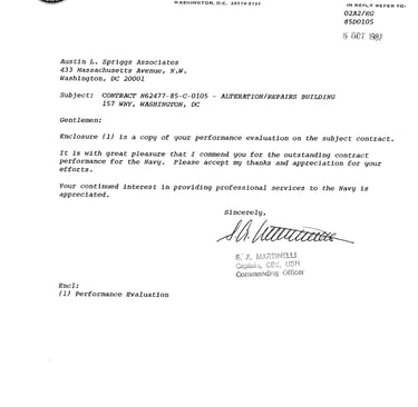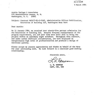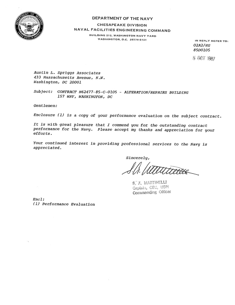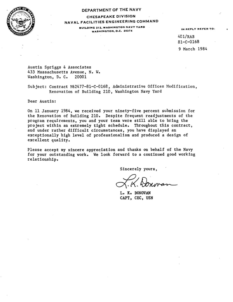 LETTERS OF COMMENDATION AND APPRECIATION FROM THE US NAVY FOR THE DESIGN OF THE RENOVATION FOR BUILDINGS 210 AND 157 AT THE WASHINGTON NAVY YARD. THE TWO WORLD WAR II MUNITIONS BUILDINGS CONTAIN 150,000 SQUARE FEET AND WILL BE THE NEW ADMINISTRATIVE HEADQUARTERS OF THE MILITARY SEALIFT COMMAND.