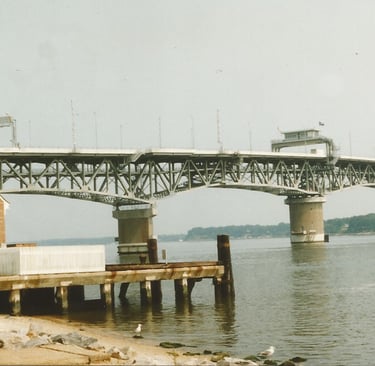 `BUILT COLEMAN BRIDGE SHOWING THE BRIDGE CONTROL HOUSE ABOVE THE BRIDGE AND THE TWO SWING SPAN SECTIONS, YORKTOWN, VIRGINIA
