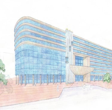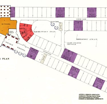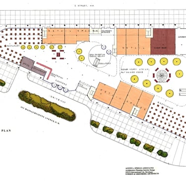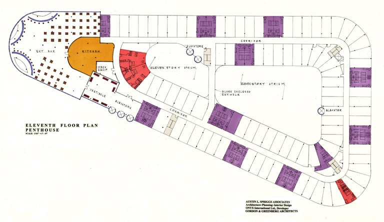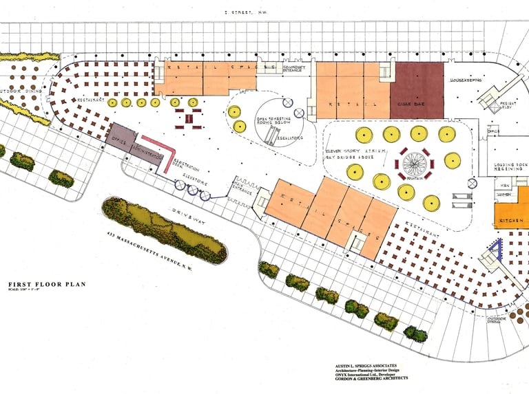 THE SCHMATIC DESIGN FOR THE PROPOSED 1,000 ROOM FIVE STAR HOTEL TO BE LOCATED IN SQUARE 516S WHICH IS THE TRIANGULAR SITE BORDERED BY MASSACHUSETTS AVENUE, L STREET AND 5TH STREET, NW WAS DESIGNED BY AUSTIN L. SPRIGGS ASSOCIATES (ALSA). THIS WAS THE SAME LOCATION OF THE (ALSA) ARCHITECTURAL OFFICE AT 433 MASSACHUSETTS AVEUE, NW. IT WAS SUBMITTED BY THE ONYX CORPORATION WHICH WAS INCORPORATED IN VIRGINIA BY ALSA. THE DESIGN WAS ONE OF THE THREE SUBMISSIONS TO THE D.C. GOVERNMENT IN RESPONSE TO THE DC GOVERNMENT'S "REQUEST FOR PROPOSAL" FOR A HOTEL TO SUPPORT THE NEW DC CONVENTION CENTER. IN ADDITION TO DESIGNING THE HOTEL, ALSA ALSO TRIED BE THE DEVELOPER OF THE HOTEL. FINANCING FOR A HOTEL OF THIS MAGNITUDE IN WHAT WAS THEN AN UNDEVELOPED AREA WAS NOT AVAILABLE. WHILE WE WERE NOT SELECTED, IT IS ILLUSTRATIVE OF THE VISION, FORWARD THINKING AND GRIT OF THE ALSA TEAM. THE HOTEL WOULD HAVE CONTAINED BELOW GRADE MEETING ROOMS, A GROUND FLOOR WITH RESTAURANTS, TEN FLOORS OF HOTEL ROOMS AND AN ATRIUM THAT WOULD HAVE EXTENDED FROM THE FIRST FLOOR UP TO THE SKYLIGHTED ROOF ABOVE THE 11th FLOOR.