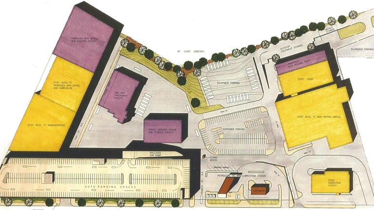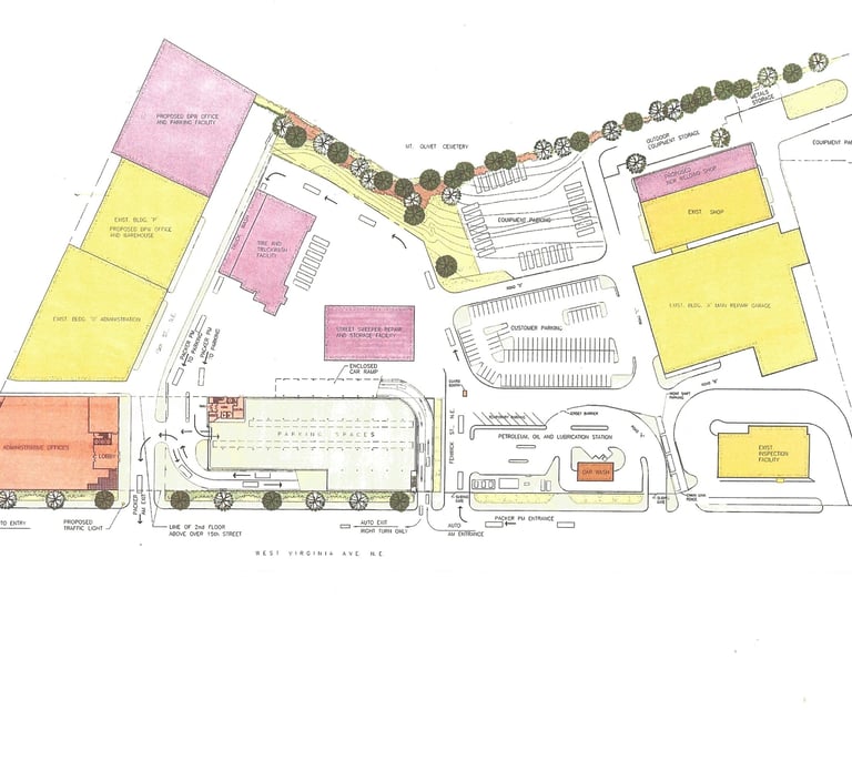 WEST VIRGINIA AVENUE CAMPUS MASTER PLAN FOR THE DISTRICT OF COLUMBIA FLEET MANAGEMENT ADMINISTRATION. THE MASTER PLAN AT GRADE LEVEL INCLUDES THE PROPOSED TWO STORY $25,000,000.00 PACKER STORAGE BUILDING ON WEST VIRGINIA AVENUE, NE.